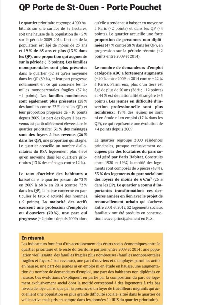 Le secteur de la Porte de Saint-Ouen – Porte Pouchet fait parti des 8 quartiers aux situations les plus défavorisées de Paris, avec le 3ème taux le plus élevé de part des foyers à bas revenu, atteignant 31% et également le 5ème taux le plus important de taux de chômage de la capitale avec 23%.