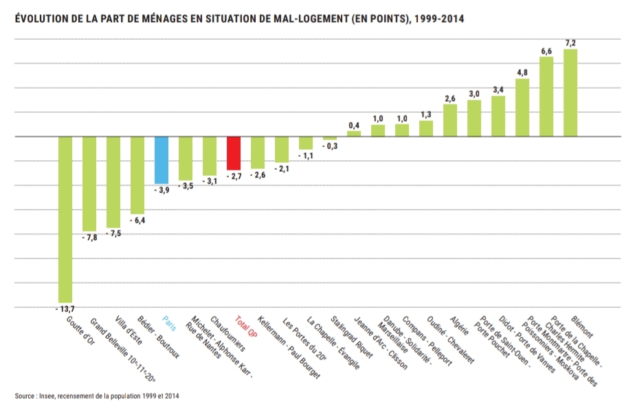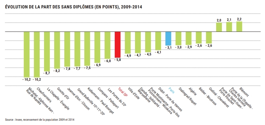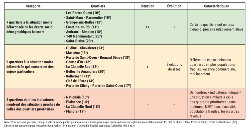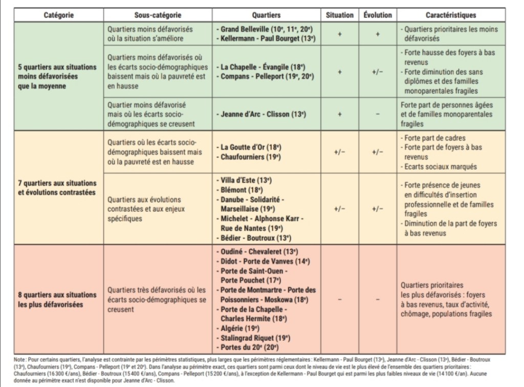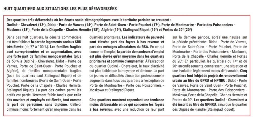 Note : on peut constater que la majorité des quartiers aux situations les plus défavorisées se trouvent au Nord Est du 75. Sur 8 quartiers, 6 sont dans le Nord Est de Paris. Seul 2 quartiers se trouvent au Sud de la capitale.