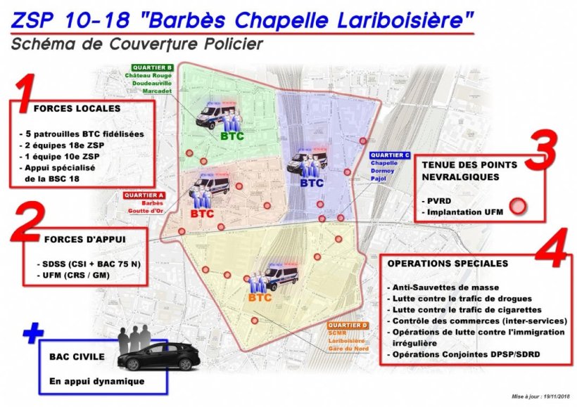 * La ZSP de Barbès / La Goutte d’or (18ème) a été étendue le 22 janvier 2018 à d’autres secteurs du 18ème, mais aussi à des quartiers du 10ème.