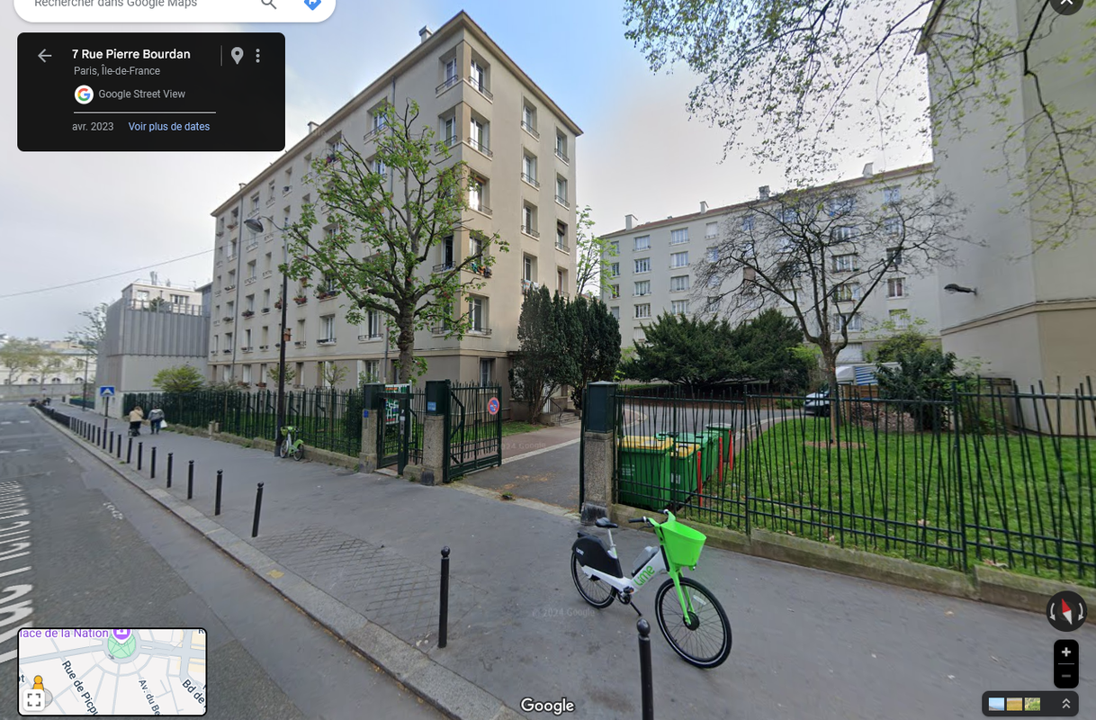 Ci-dessus, la cité des Rigoles dans le 20ème, qui est composée de 9 bâtiments (8 tours et une grande barre). La cité est située entre la rue des Rigoles, la rue Frederick Lemaître, la rue Olivier Métra et la rue de l’ermitage. Au milieu des immeubles, se trouve le petit stade du tiékart accessible via la rue Olivier Métra. Le quartier s’étend également à un petit ensemble HBM situé de l’autre côté de la rue Olivier Métra, en face des tours. En dehors de la cité, ça squatte aussi la Place des Grandes Rigoles (renommée Place Henri-Malberg).