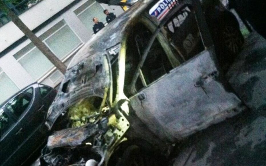 La Banane, rue Duris (XXe), ce lundi. Trois agents du GPIS (Groupement parisien interbailleurs de surveillance) ont été blessés par un engin incendiaire jeté contre leur voiture. (DR.)
