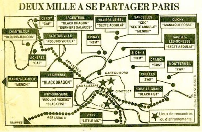 Cet article n’a pas pour vocation de résumer ou d’approfondir le sujet, mais uniquement de lister grossièrement les gangs et les quartiers en IDF où ces gangs étaient basés. D’ailleurs, cette liste n’est pas exhaustive, loin de là, il y a très certainement des oublis.